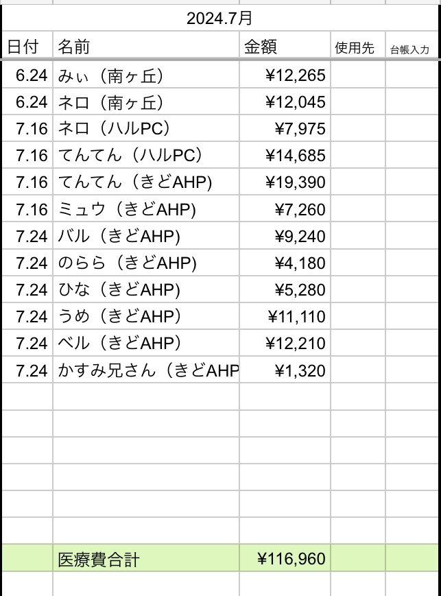 7月は10匹の子たちに、¥116,960 の医療費がかかりました。