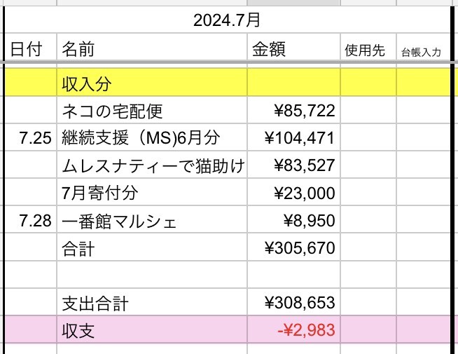 ※7月にInstagramにて開催していただきました「海豆ファミリー猫助けチャリティー」での収入は収支が間に合わなかったので来月に回させていただきます。