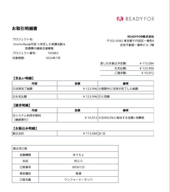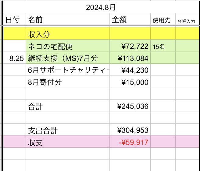 今回も遅くなってしまいましたが、みなさまにご支援いただきました7月の継続寄付分のご報告と8月の収支報告をさせていただきます。