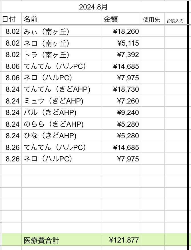 8月は8匹の子たちに、¥121,877 の医療費がかかりました。