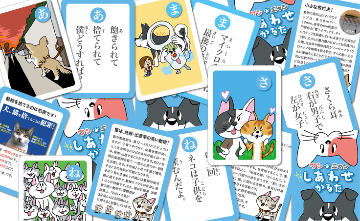 保護犬だったsoraを我が家に迎えた事がきっかけで、保護犬猫のための啓発活動のお手伝いをさせて頂いています。ボランティアの方々の活動を見聞きしている時に、もっと自分たちが出来る事がないのかと考えたとき、かるたで動物福祉の啓発が出来るのではと思ったのです。それを古賀さんに相談し、今回のプロジェクトになりました。少しでも多くの犬猫が幸せになってほしいと願っています。ご理解ご賛同を頂き、ぜひご協力をお願いいたします。