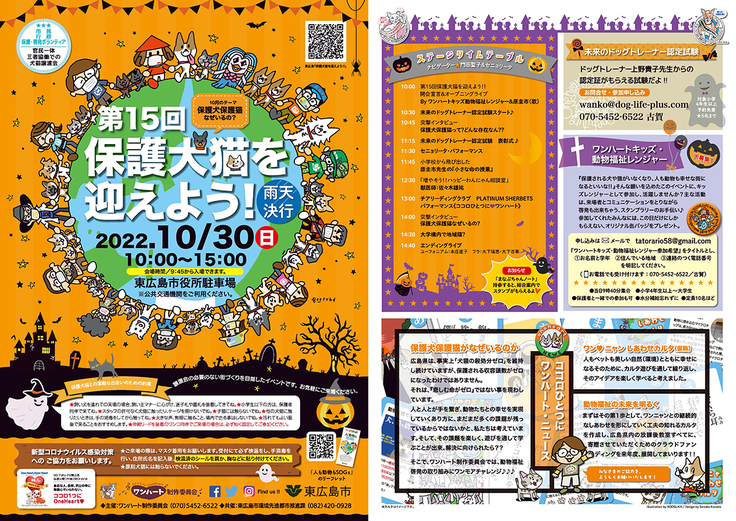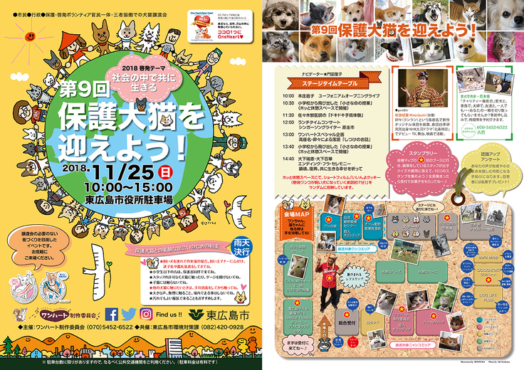 私たちはイベントのたびに、ポップで可愛らしく、ギュっと目を引くデザインの啓発チラシを作成し、東広島市を通して、市内の小・中・高校生全生徒に配布させていただいています。例えイベントに参加することが出来なくても、そのチラシを見るだけでも、『人と動物との共生について』、なにかを考えるきっかけになるようなデザインに、いつも仕上げていただいています。