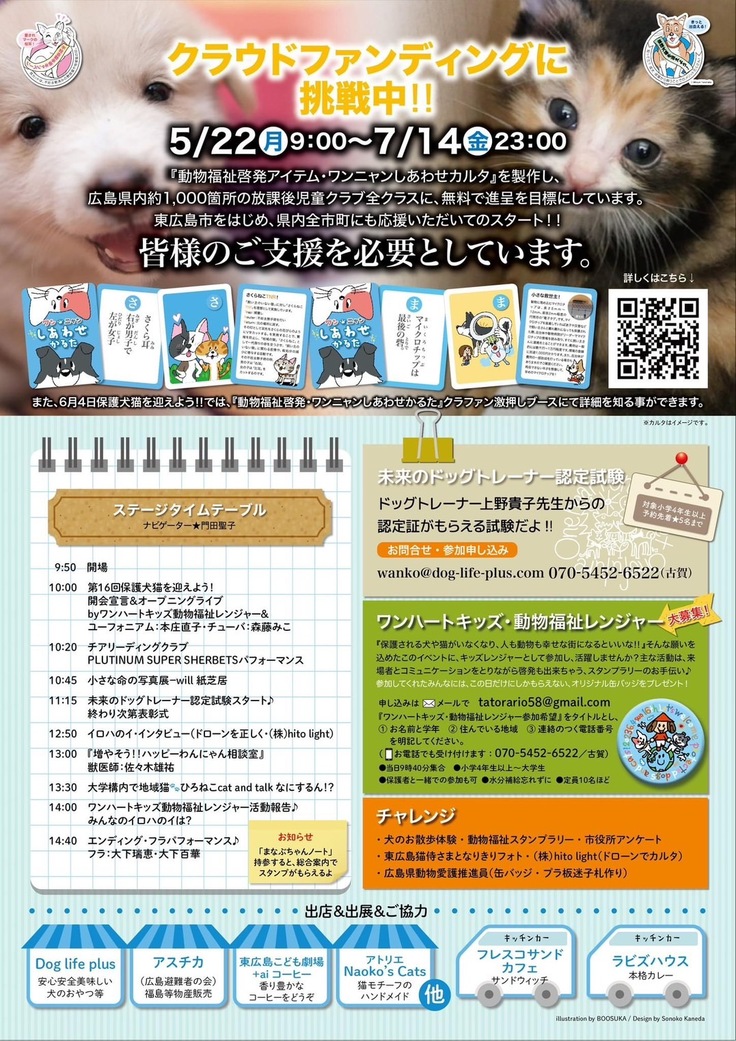 会場内での運営スタッフとして尽力していただいたり、来場者とのコミュニケーションをとり、啓発すること(お話して伝える事)の大切さを体験してもらえるワンハート動物福祉レンジャーや、ワンコとの動物福祉の観点から学び取る、行動学的見地からの体験実施を含む、未来のドッグトレーナー認定試験開催 など、さまざまな募集をかけております《参加申し込み・お問い合わせ:tatorario58@gmail.com 070-5452-6522/古賀》