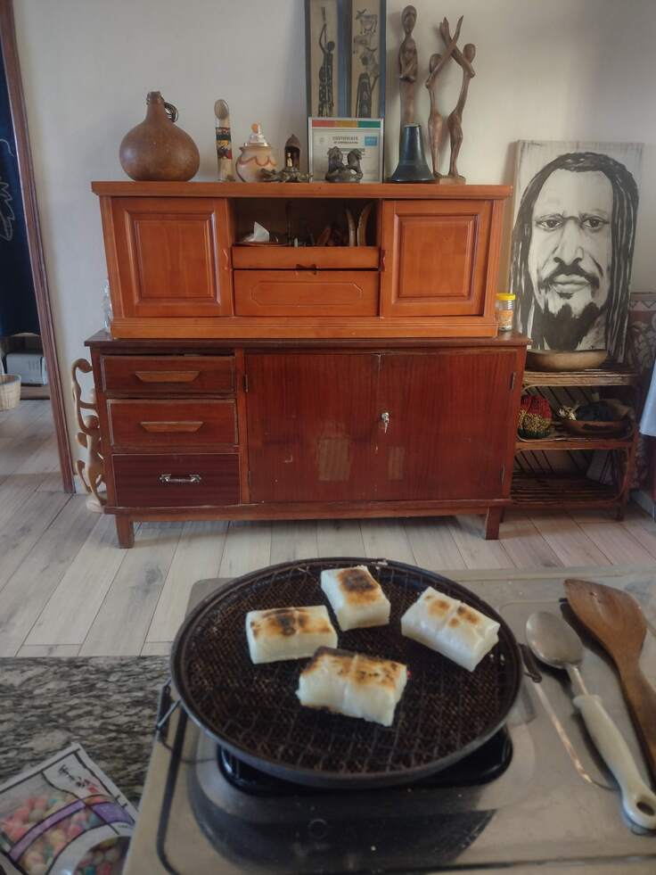 で、そんな高価なお餅を網で焼いて、美味しくいただいたわけです。お餅を焼きながらも、向こうから絵に描かれたガテラが焼き具合をチェックしていて、考えてみると料理作るたびに見られているような気がするので、この絵は他の場所に移すことにした。