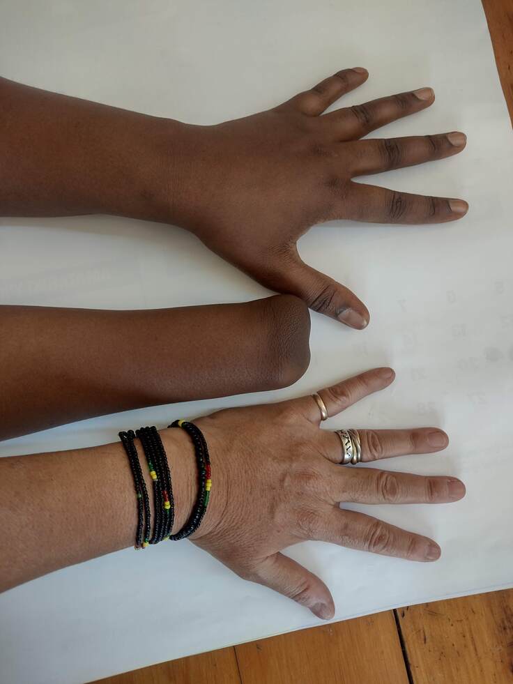 日本だとどうしても日本人色(にほんじんいろ)の手を作り慣れているだろうから、比較するために私の手も横に置いて写真を撮る。