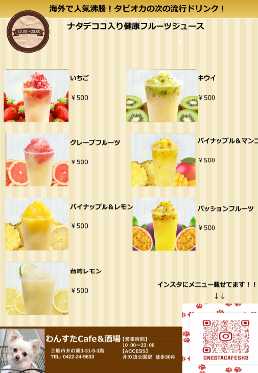 またメニュー表できましたらお料理、お酒やソフトドリンク等アップしていきます!