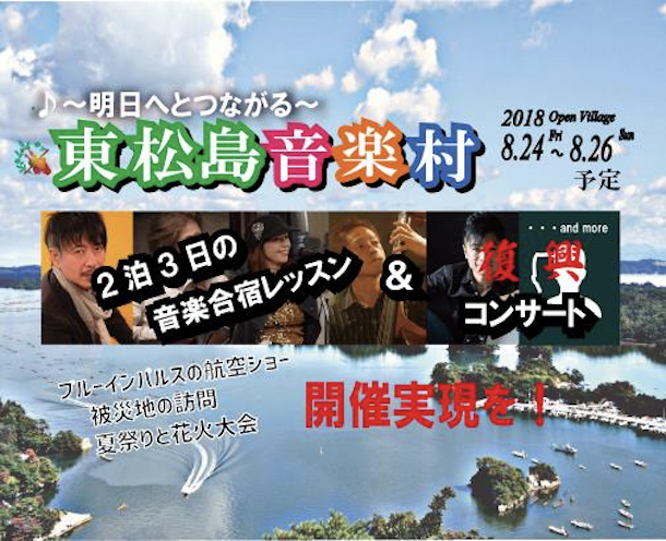 昨年(2017年)は、群馬県沼田市で行った音楽村ですが、今年は宮城県東松島市で行います。被災地での開催という事もあり、より多くの学生に指導し音楽を通じて夢と希望を持って欲しい、また、仮設住宅にお住いの方をひとりでも多くコンサートに招待し、沢山の笑顔を作りたいと思っております。どうかみなさまご協力お願い申し上げます!
