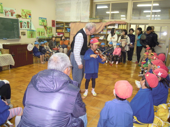(幼稚園での指導も行いました。小さな体に真剣な眼差しでヴァイオリンを楽しむ姿は、未来への希望を感じさせてくれます。)