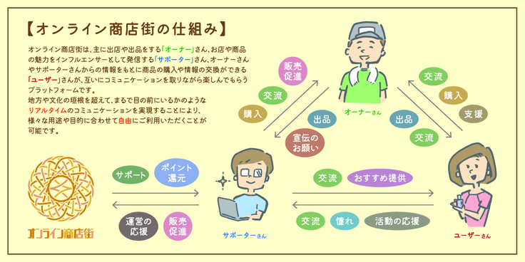 オンライン商店街とは、どんな場所でも、どんな人とも、気軽にコミュニケーションが取れたり、サポートしあえる生産者直送のECプラットフォームです。