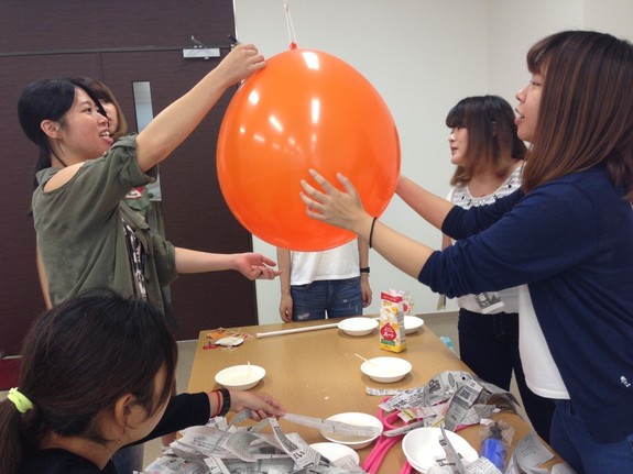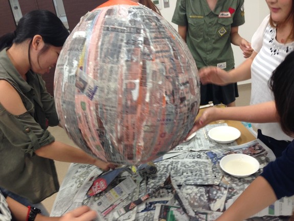 まずは、ピニャータのベースとなる風船に、小麦粉をつかったでんぷんのりを塗って、新聞紙を張っていきます。
