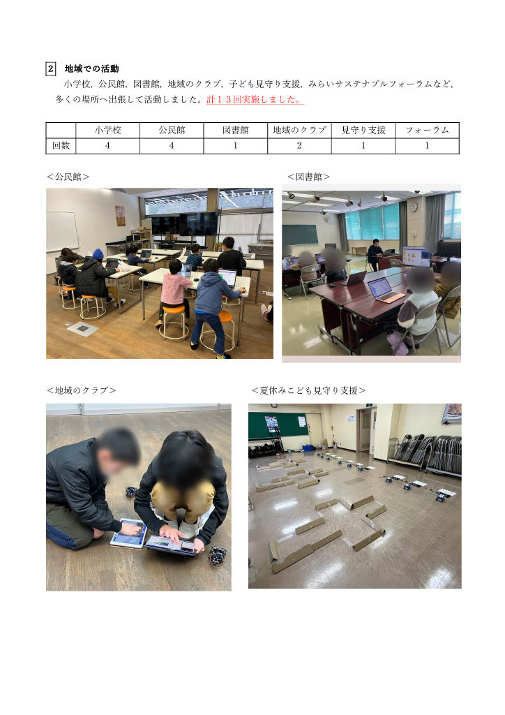 おかげさまで毎月2回のクラブの活動は続けながら(今年は合計20回程)、公民館・図書館でのイベントや市内の子どもクラブでの出張講座、小学校でのロボットプログラミング講座、夏休みの見守り支援での講座など、クラブ以外での場所でも(合計13回)活動することができました。