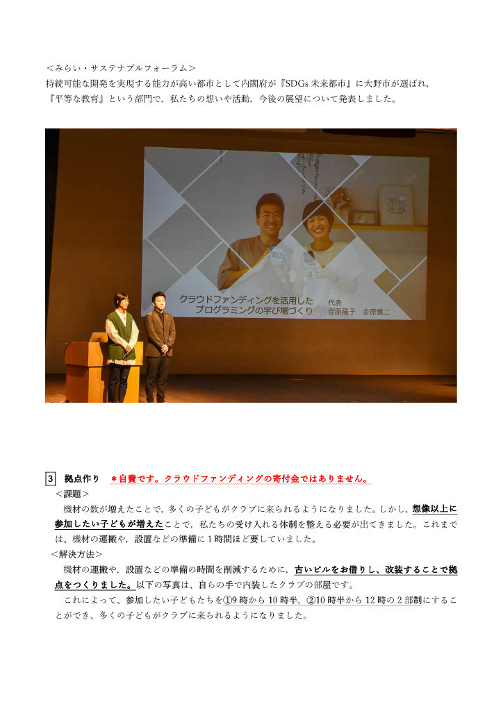 活動とは別になりますが、持続可能な開発を実現する能力が高い都市として内閣府が『SDGs 未来都市』に大野市が選ばれ, 『平等な教育』という部門で,「みらいサステナブルフォーラム」にて私たちの想いや活動,今後の展望について発表しました。