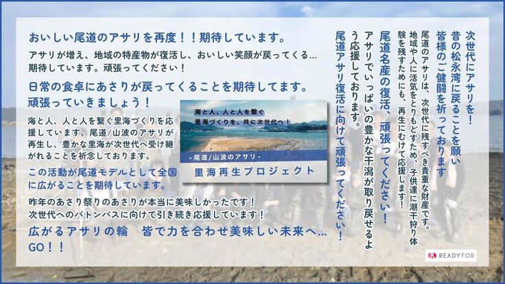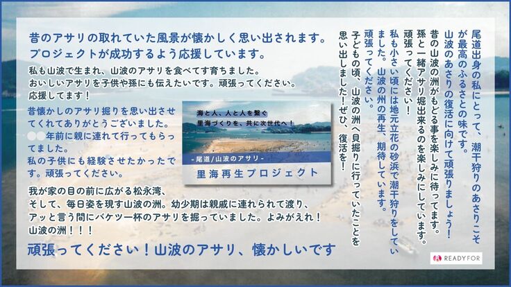 皆さまから頂戴したご寄付、そして応援を、アサリ再生、そして人を繋ぐ豊かな里海・松永湾の実現にしっかり繋げていきたいと思います。