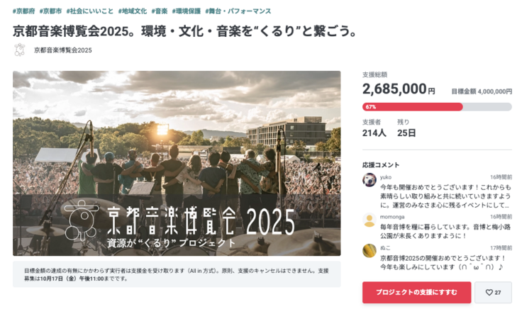 現在、210名を超える方々からのご支援をいただいており環境・文化・音楽が循環する“音博”のための挑戦への仲間が増えていくことが本当に嬉しい限りです。