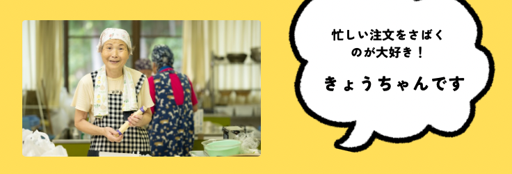 スタッフの平均年齢は70歳を超えています。お店では、いつもおばあちゃん達の笑い声が絶えず、みんな第二の青春を謳歌しています。もちろんファストフード店のようなスピード感はありませんが、長年の料理の味とおばあちゃんたちの優しさに癒される、というお客さんが続出です。おかげさまで市外や県外の方にもお越しいただき、沢山の方に愛されて昨年10周年を迎えることができました。