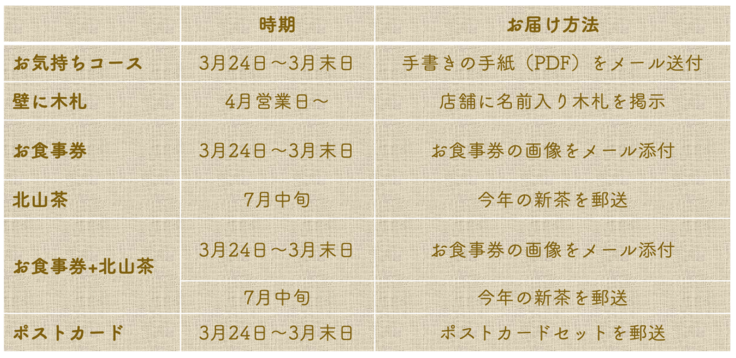 つきましては、営業再開に合わせて、クラウドファンディングでご支援いただいた皆様へのリターンをお届けしたいと思います。大変長くお待たせして申し訳ありませんでした。以下のスケジュールで順次お届けしてまいりますので、よろしくお願いします!