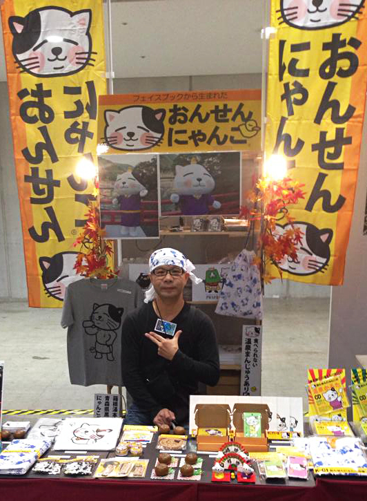 「おんせんにゃんこ」は、東北大震災から1年が経った2012年の3月11日から、私がFacebookで毎日イラストをアップしている、浴衣を着た猫のキャラクターです。震災後、東北方面の友達にFacebook上で「おはよう」の挨拶をするのに言葉を選ぶ日々が続いていた当時、「キャラクターのイラストか何かがあれば、そのキャラクターの話題で返事を返してくれるようになるのではないか」と思い、「おんせんにゃんこ」のイラストを毎日アップするようになりました。そうしているうちにFacebookの友達がファンになってくれたのがキッカケで、グッズや着ぐるみを作るようになり、全国の温泉の応援をするようになりました。