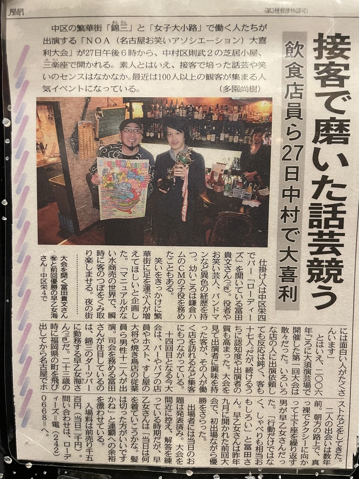 またお笑い好きが高じて学生時代にお笑い芸人を目指し、大須演芸場を中心に出演させて頂いていました。そして地域活性化、飲食店を盛り上げる為、「NOA(名古屋お笑いアソシエーション)」というグループを立ち上げ、仲間の飲食店の方々と年に1・2回、約10年に渡り大須演芸場にてお笑いイベント大喜利大会を開催しております。