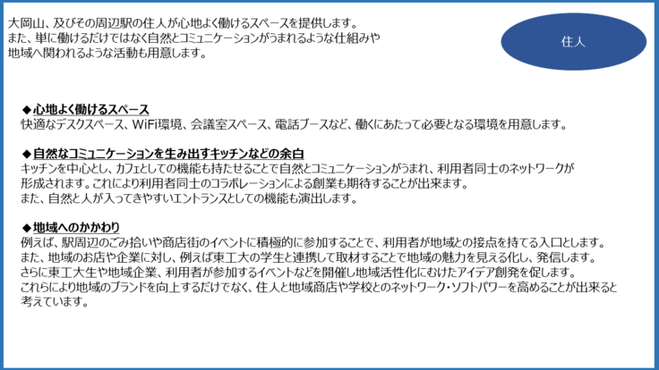 そういった思いを持つ方もいらっしゃると思いますし、そういった方が地域にかかわることで大岡山がよりいい街になっていくと考えています。