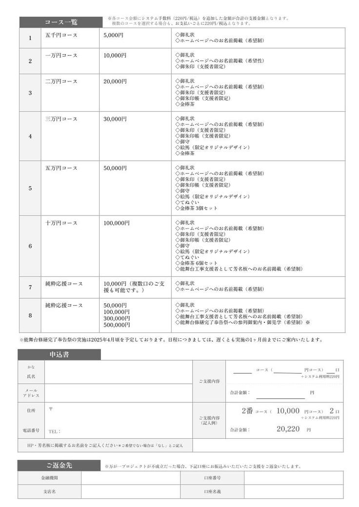 以下の内容を、大野湊神社宛にご郵送またはメールまたはFAXでお知らせください。また、クラウンドファンディングチラシ裏面に申込用紙がございますので、そちらにご記入いただき、ご持参いただくか、FAXいただいても結構です。
