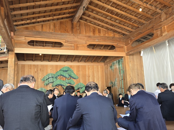 祭典後は能舞台へ移動し、施工者より修繕工事の概要説明をしていただき、その後、金石宝生会より能舞台に関する説明をしていただきました。