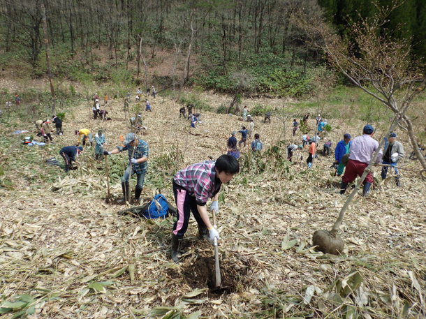 里山は手入れされず荒廃する一方です。「ふるさと山の会」では、手入れを行い、花、紅葉を楽しめる木々の植林を平成23年から毎年行っています。