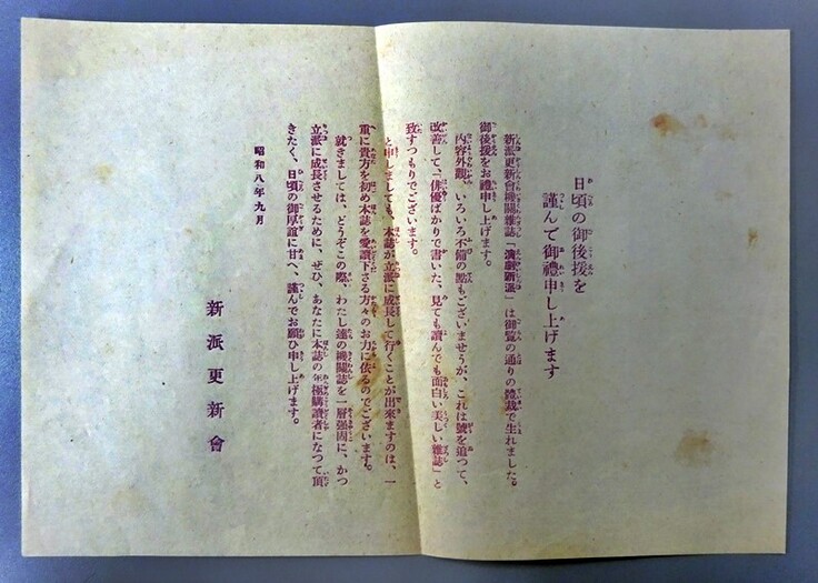 初代喜多村緑郎をはじめとした新派幹部34名でつくった「新派更新會」という組織が「俳優ばかりで書いた、見ても読んでも面白い美しい雑誌」を毎月発刊しようと始まり、昭和15(1940)年9月号まで7年間出版されました。