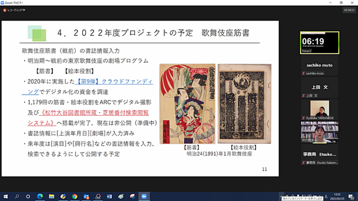 松竹大谷図書館が参加しているプロジェクトは、「演劇上演記録データベースを活用した、演劇資料画像検索閲覧システムの構築に関る研究」です。今回の発表では、まず松竹大谷図書館のスタッフから、共同研究プロジェクトの概要として松竹大谷図書館のご紹介と公開中のデジタルアーカイブの説明、2021年度の成果報告を行いました。2021年の成果の一つである演劇上演記録データの進捗状況としては、2015年より続けてきた舞踊会プログラムを用いた演劇上演記録データの考証入力が今年度で終了する見込みとなったことをご報告し、もう一つの成果である歌舞伎ブロマイドの考証作業については、現在写真の考証と書誌情報の入力を分担して進めている状況をご説明しました。また2022年度に申請中のプロジェクトで行う予定の歌舞伎座筋書の書誌情報入力については、今まで行ってきた演劇資料の画像検索閲覧システムを使って、書誌情報をweb上で考証入力に活用できることができるようになり、各データベースが連動してきたと実感していることなどを挙げました。