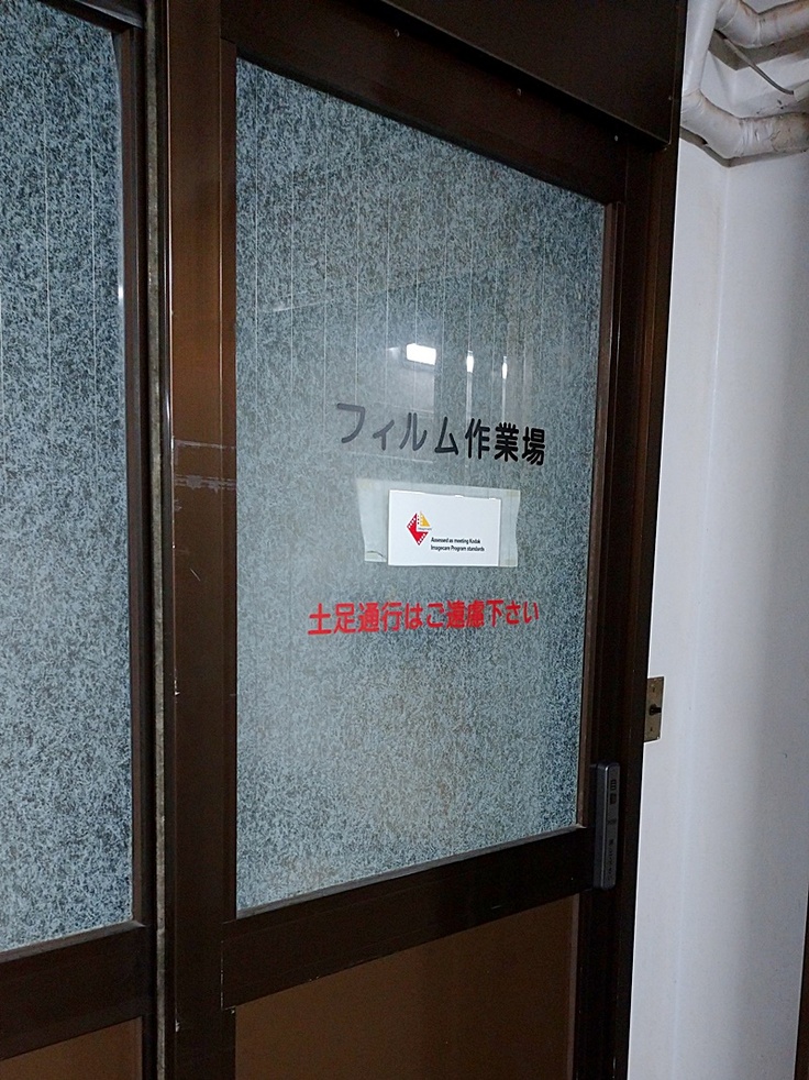フィルム作業場の入口に到着すると、作業場内は土足厳禁ということで、入口の引き戸の前で、靴を室内用の履物に履き替えました。