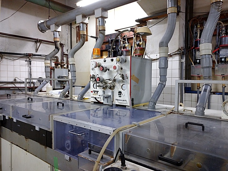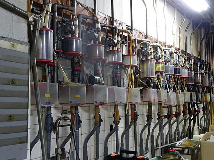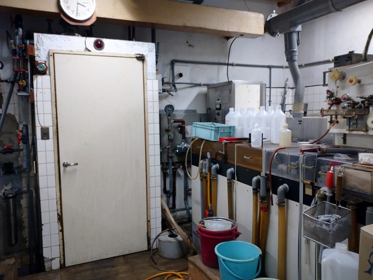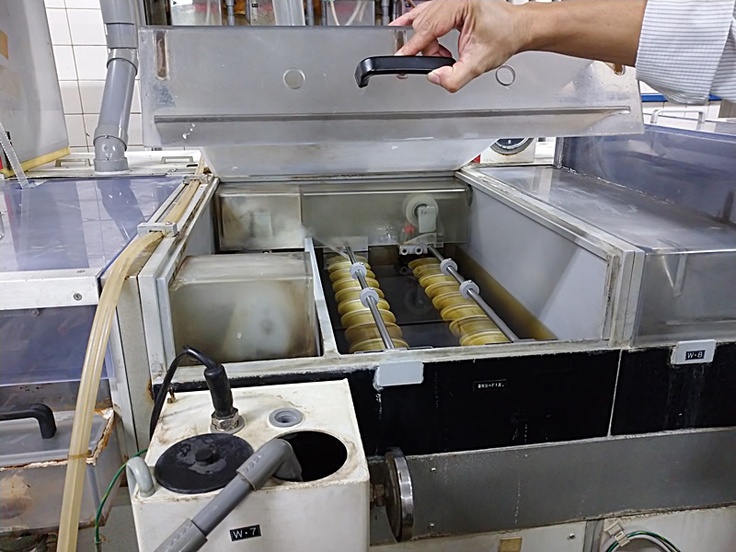 こちらはカラーフィルム用の現像機です。お邪魔した時には、作業は行われていませんでしたが、現像機内の現像液を見せて頂きました。こうした現像液の希釈やフィルムの洗浄などに使用するため、現像作業には多くの水が必要ですが、東京現像所さんが所在する調布は、近くには江戸時代から湧き水を利用した蕎麦が名物の深大寺もあるという、元来湧き水が豊富な土地柄です。この豊富な水源を頼りにここに現像所を作ったそうで、敷地の中庭の地下には巨大なプールが設けられており、大量の地下水が湛えられているそうです。また、現像液などの薬品は、社屋の2階で、気温や湿度などを考慮しながらその日の現像作業の予定に合わせて必要な量を自社で作っているそうです。こういうところにも職人気質といえる経験と歴史を感じることができました。