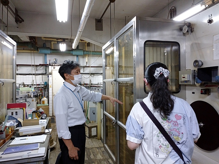 中に入ると、設立当初からのフィルムの現像機が並んでおり、その様子はまるで映画に出てくる科学実験工場のセットのようでした。音声スキャンの作業を見学させて頂く前に、現像機のエリアを少しだけ、営業本部部長の清水俊文氏にご案内を頂きました。前述のようにフィルムを使った撮影は少なくなっていますが、フィルムは人間の肌を美しく撮るのに適しているということで、化粧品など一部のCMでは今でもフィルム撮影が行われているなどフィルム現像の需要はあり、現像機は今でも現役です。