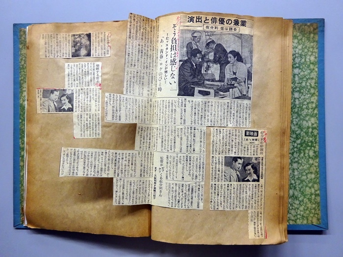 右上の新聞記事の写真には左に佐分利信、右に映画主演の高峰三枝子が写っています。タイトルには「演出と俳優の兼業 佐分利信は語る」とあり、写真の左の見出しに「そう負担は感じない」と佐分利信自身の言葉がありますが、すぐその横には「たゞスタンド・インが欲しい」とも記されています。スタンド・インとは立ち位置などを確認するために俳優の代わりをつとめる人のことで、兼業ならはでの苦心がこの記事から伝わってきます。