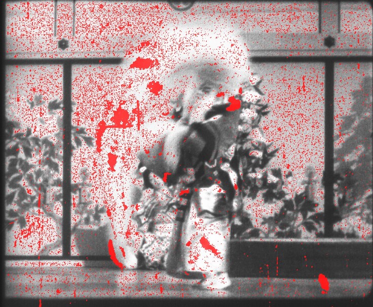 パラと呼ばれるフィルムに付いた傷やゴミをデジタル処理で消していく作業です。映写や劣化によりフィルムに付いたパラを、まずソフトにより自動検出してある程度削除します。写真で赤くなっているのが、ソフトがパラと判断した箇所です。