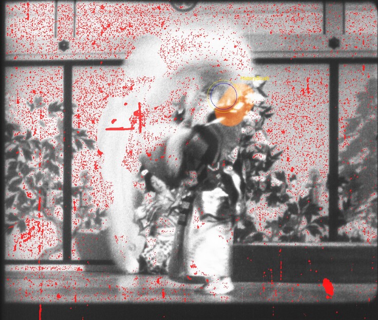 このように着物の柄や光沢、獅子の毛先なども、ソフトがパラと判断してしまう事があるため、自動検出する際も、作業箇所毎に検出する強弱を調整します。その後、細かい手作業により一つ一つ傷を消していきます。修復の中で最も時間が掛かる作業で、ソフトの性能が上っている現在でも、ソフトの判定を必ず目視で1コマ1コマ確認し、ソフトが消し過ぎた部分は元に戻し、ソフトが取り残した部分は手作業で消していきます。