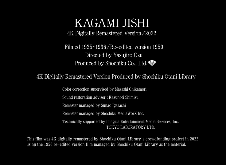 上映用の4Kデジタルシネマパッケージ(4KDCP)には、冒頭に4Kデジタル修復版のクレジット(先付タイトル)が付いています。クレジットの最後には、「本作は松竹大谷図書館が管理する1950年再編集版のフィルムを素材として 2022年に同図書館が実施したクラウドファンディング事業により4Kデジタル修復されたものである」と4Kデジタル修復版が、この【第11弾】クラウドファンディングにご支援ご協力いただいた皆さまのお力添えにより完成した事を説明しています。