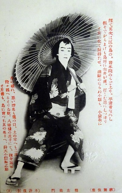 写真は、「歌舞伎座當り狂言 白浪五人男」の絵はがきです。明治44[1911]年4月歌舞伎座で上演された『弁天小僧』公演の際に作られたものと思われます。