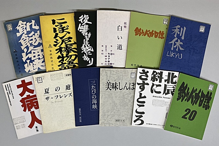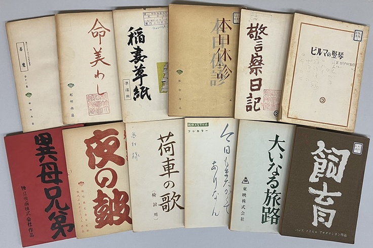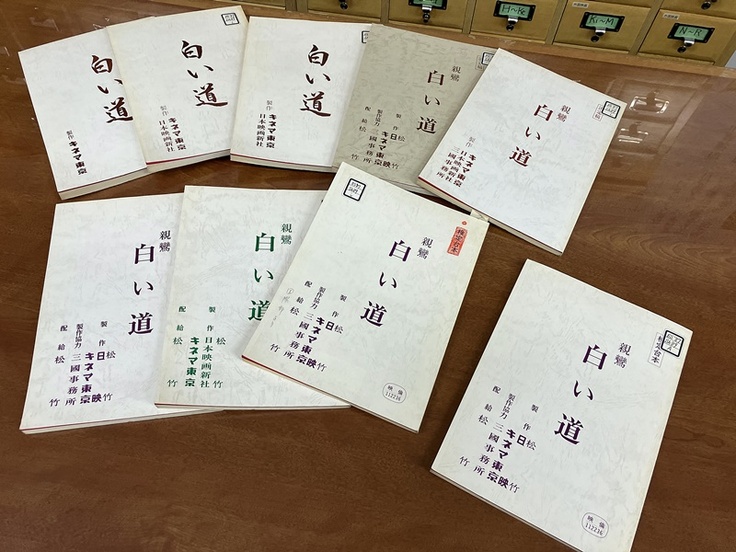 上の写真は全て台本です。映画は、製作各段階でさまざまな台本が作られます。最初に準備稿が作られ、続いて改訂稿、決定稿、撮影稿など改訂が反映された台本が作られます。作品によっては、何種類も作られ、ときには10冊以上になることも。『親鸞 白い道』は、この各段階での台本が特に多い作品で、計9冊の台本があります。