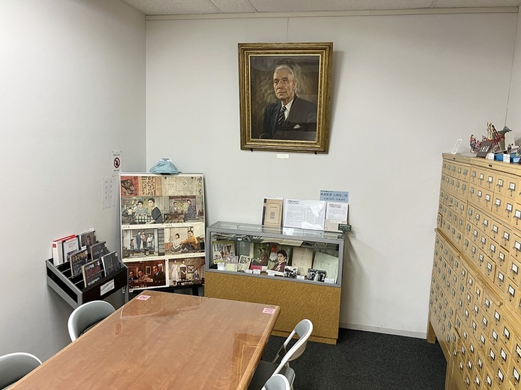 第4期歌舞伎座が閉場した際にロビーにあった展示ケースをもらい受け、念願の閲覧室内での所蔵資料展示を始めたのが2010年のことで、第1回目の展示は当館の創立者「大谷竹次郎」の展示でした。それから13年を経て、100回目の展示を迎えることができました。この節目を松竹に縁ある巨匠、小津安二郎監督の展示で迎えられること、嬉しく思っております。大変小さなケースでの展示ですが、来館された方々に少しでも資料を見ていただけるよう、今後もがんばってまいりたいと思っております。