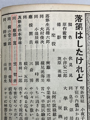 大部屋生活が続いた笠智衆ですが、はじめてその名が配役に載ったのは、小津安二郎監督作の『落第はしたけれど』(1930年)でした。