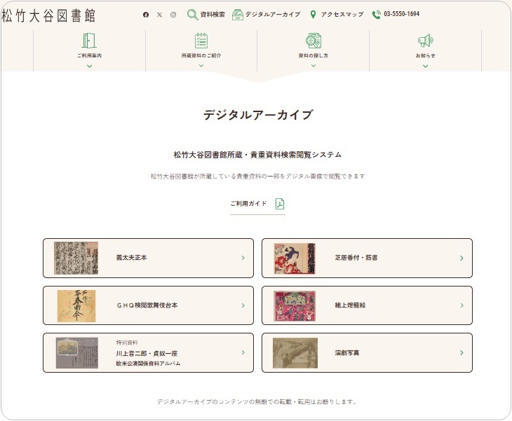 これまでのクラウドファンディングのご支援によりデジタル化を実現できた「芝居番付・筋書」「GHQ検閲歌舞伎台本」「組上燈籠絵」「川上音二郎・貞奴一座欧米公演関係資料アルバム」「演劇写真」の5つを含む、現在公開中の当館の6つのデジタルアーカイブの検索閲覧システムへのリンクボタンを大きく表示しました。それぞれのリンクボタンには、デジタルアーカイブの資料画像の一部をデザインに採用し、資料のイメージが伝わりやすくなるように工夫しました。