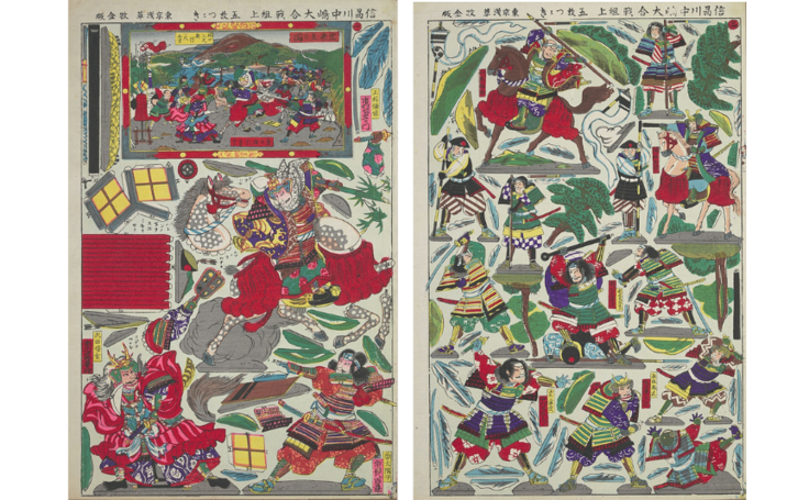 甲斐の武田信玄と越後の上杉謙信が信州の川中島に対陣した「川中島の戦い」で、激戦の中、謙信自ら本陣の信玄めがけて斬り込んだという有名な逸話が描かれた組上燈籠絵から、登場人物を抜き出してシールにしました。(デザイン:北本裕章)