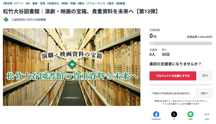 13回目のクラウドファンディングへの挑戦となる本年は、当館の使命である「演劇・映画の貴重資料を守り、これからも増え続ける資料を未来につないでいく」ということへの想いを、これまでご支援をいただいた皆さま、そして新たに当館を知っていただく方々にお伝えし、末永く応援していただくきっかけにしたいと考えています。