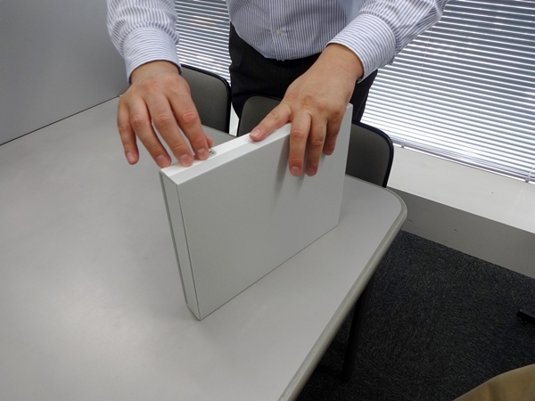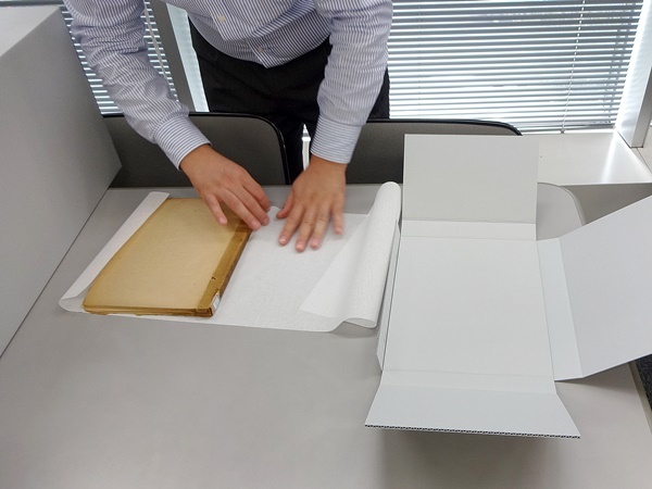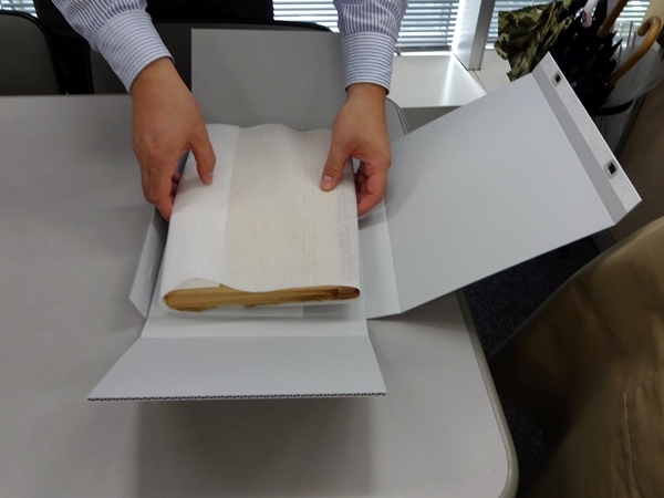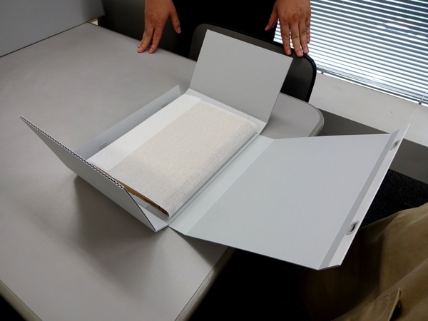 「タトウ式保存箱」は箱といっても、箱状のものではなく、着物を保管するタトウ紙のように、上下左右から資料を包み込んで、留め具で閉じると箱の形になる保存箱です。