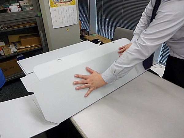 一段分のスクラップブックをまとめて「組み立て式棚はめ込み箱」に入れることで、書庫のスペースを考慮しながら、スクラップブックを保護することが出来ます。工房で制作されたのち、平らな状態で納品されるので、軽く扱いやすく、組み立てる際に糊や接着剤を使用せず、保存する資料に良い環境というだけでなく、組み立ても簡単です。