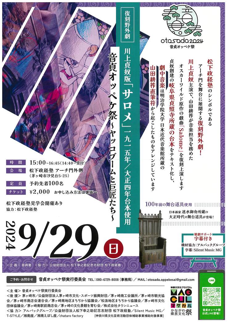 今回の「音貞オッペケ祭」では、貞奴が主演で、作曲家・山田耕筰が音楽を担当したオスカーワイルド原作の戯曲『サロメ』を復刻野外劇で上演します。