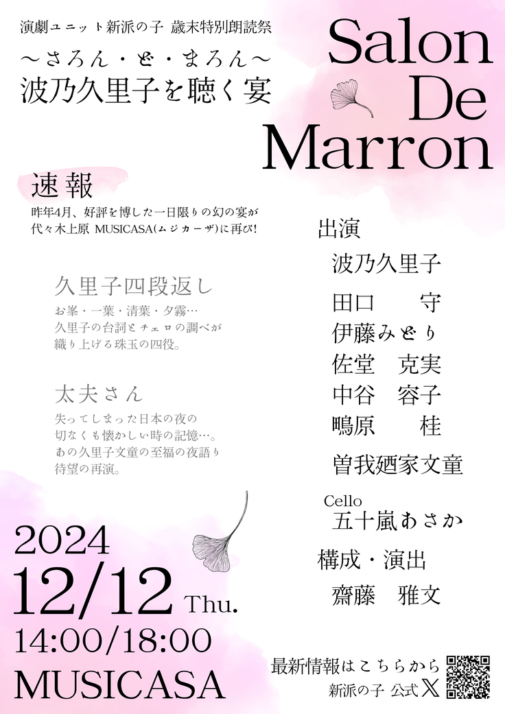 12月には、齋藤雅文さまが立ち上げた演劇ユニット新派の子「さろん・ど・まろん」の公演で、北條秀司作品『太夫さん』の朗読に取り組むお二人。作品の魅力やお稽古の様子など、どんなお話が飛び出るのか…どうぞお楽しみに!