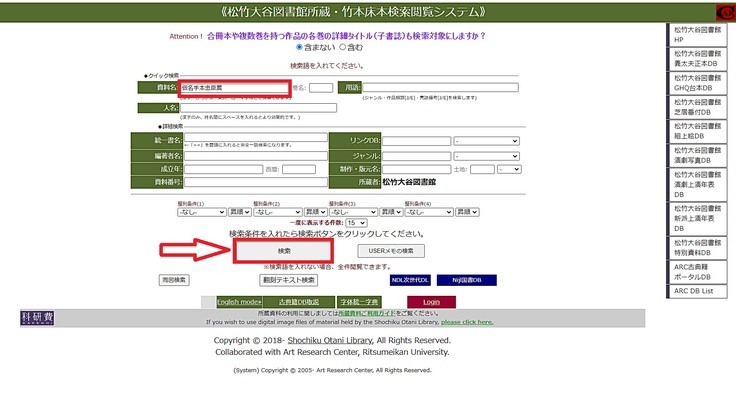 今回は[資料名]の項目に「仮名手本忠臣蔵」と入力して「検索ボタン」をクリックしてみます。