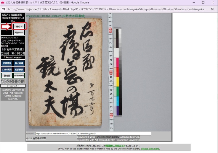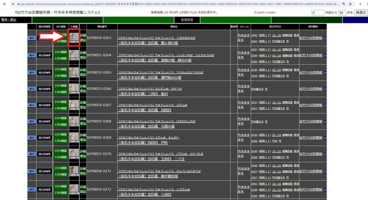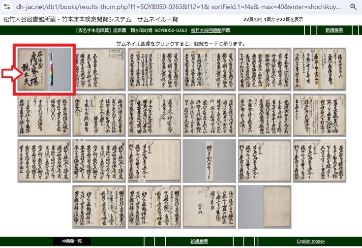 すると、床本の全ページの「サムネイル画像」が別ウィンドウで表示されます。サムネイル画像を選んで大きく表示してみましょう。例えば表紙のサムネイルをクリックすると、表紙の画像を大きく見る事が出来る「閲覧画面」が表示されます。