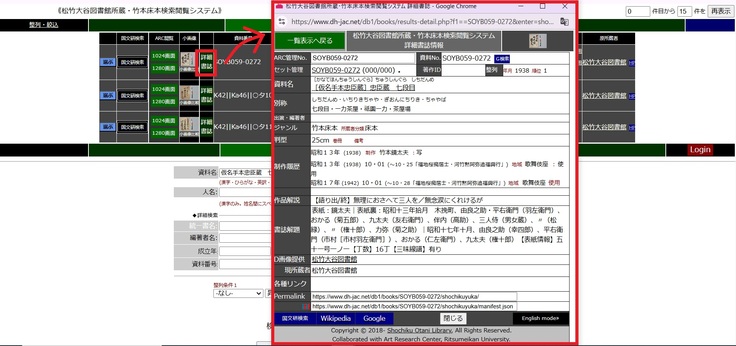 このデータを、立命館大学アート・リサーチセンターの赤間亮先生のご協力のもとに、《竹本床本検索閲覧システム》を構築していただき、この度10月18日より松竹大谷図書館HP内のデジタルアーカイブにおいて590 件のデータを公開いたしました。