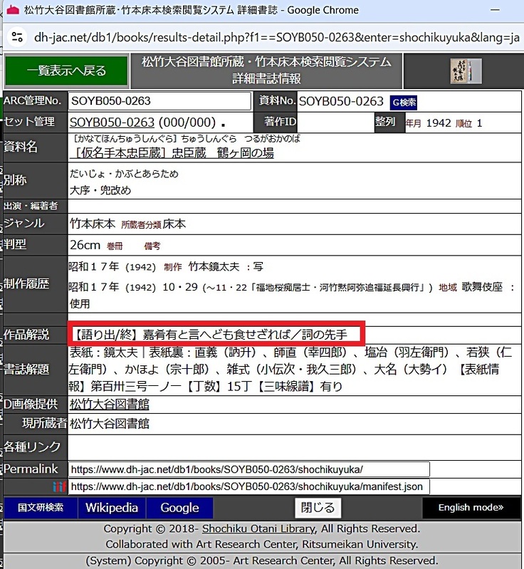 書誌データについては他にも細かい入力がしてあります。たとえば、[詳細書誌]の[作品解説]を見ると、【語り出/終】とあります。同じ幕を語った床本であっても、「口」といわれる前半部分から始まる床本なのか、「奥」といわれる後半部分の床本なのか、[資料名]の情報だけでは、どの部分が語られている床本なのか分からない場合があります。そのため、竹本葵太夫様のご提案と監修により、「語り出し」と「末尾」の詞章を入力し、どの場面の床本なのかが分かるようにするなど、実演家の方々にも利用しやすいデジタルアーカイブを目指しました。